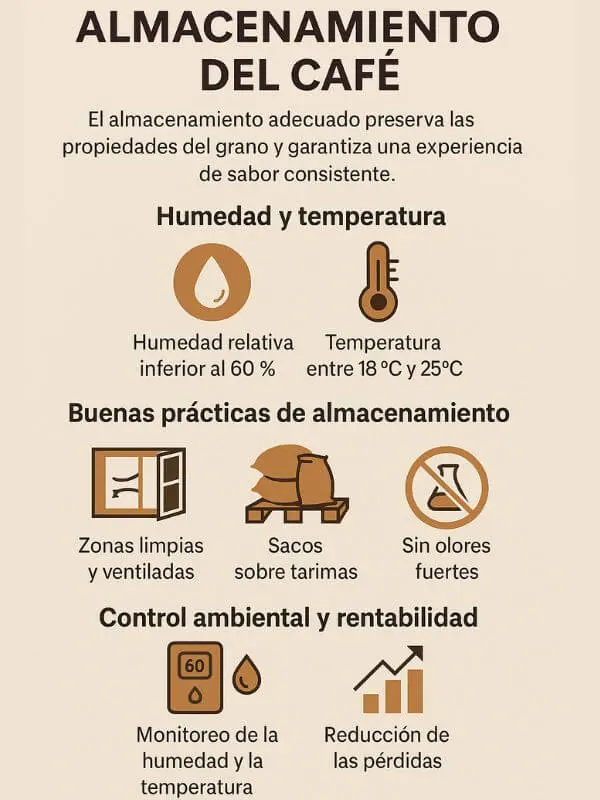 La humedad y la temperatura son dos de los factores más determinantes en la conservación de la calidad del café. Una humedad relativa superior al 60 % puede generar la proliferación de mohos y bacterias, además de provocar que el grano absorba humedad del ambiente, lo que altera su peso y sabor. Por otro lado, temperaturas elevadas o fluctuantes aceleran la oxidación de los aceites naturales del café, disminuyendo su aroma y acidez característica.